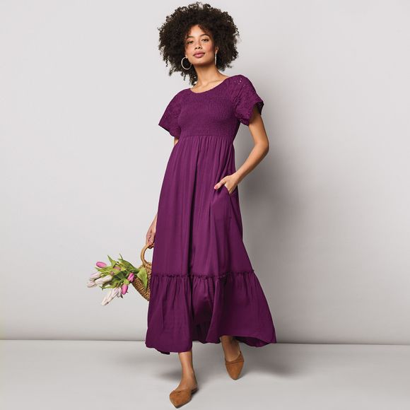 I want to tell you about the dress I bought. I love it! I was very hesitant about buying the dress because most of Avon's dresses are polyester and spandex which shows every curve way too boldly for my taste. Plus, when you're short like me, their dresses are usually way too long. I took a gamble and purchased the Eyelet Sleeve Smocked Maxi Dress. I nervously tried the dress on when it arrived and I was super impressed. The length was perfect! The dress is soft and is a very pretty shade of purple. I wore it to work the other day and received lots of compliments on it. It was cool and comfortable. I plan to get lots of wear of it this summer.
